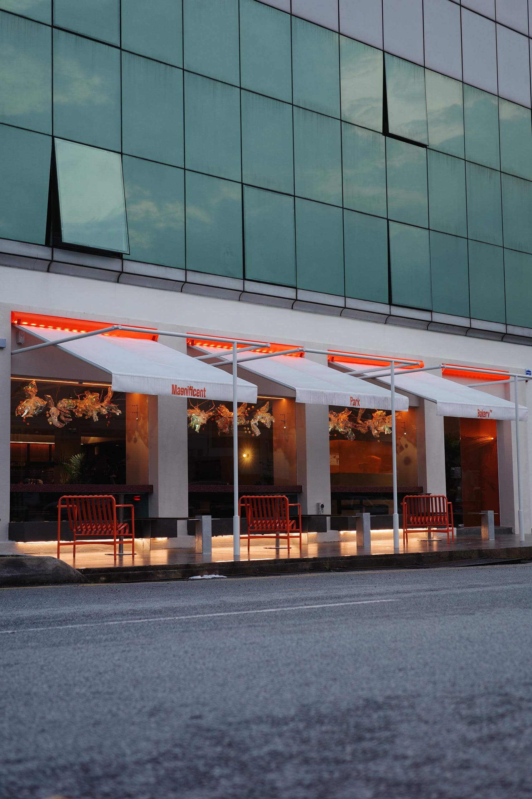 A glass pavilion dining experience, designed and built by Threno. Offering a vibrant, sunlit ambiance for daytime dining and a serene, intimate setting for the evening crowd.