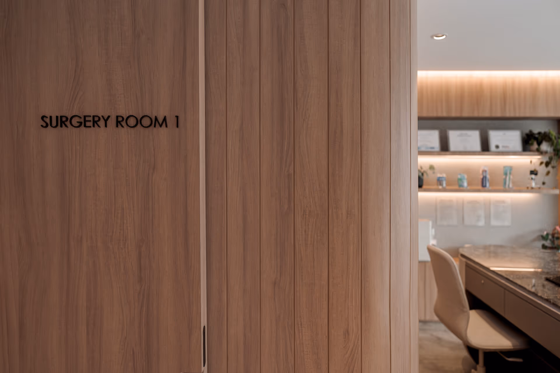 Cool metallic finishes have been offset with warm lighting to create a soothing environment for this dental clinic.