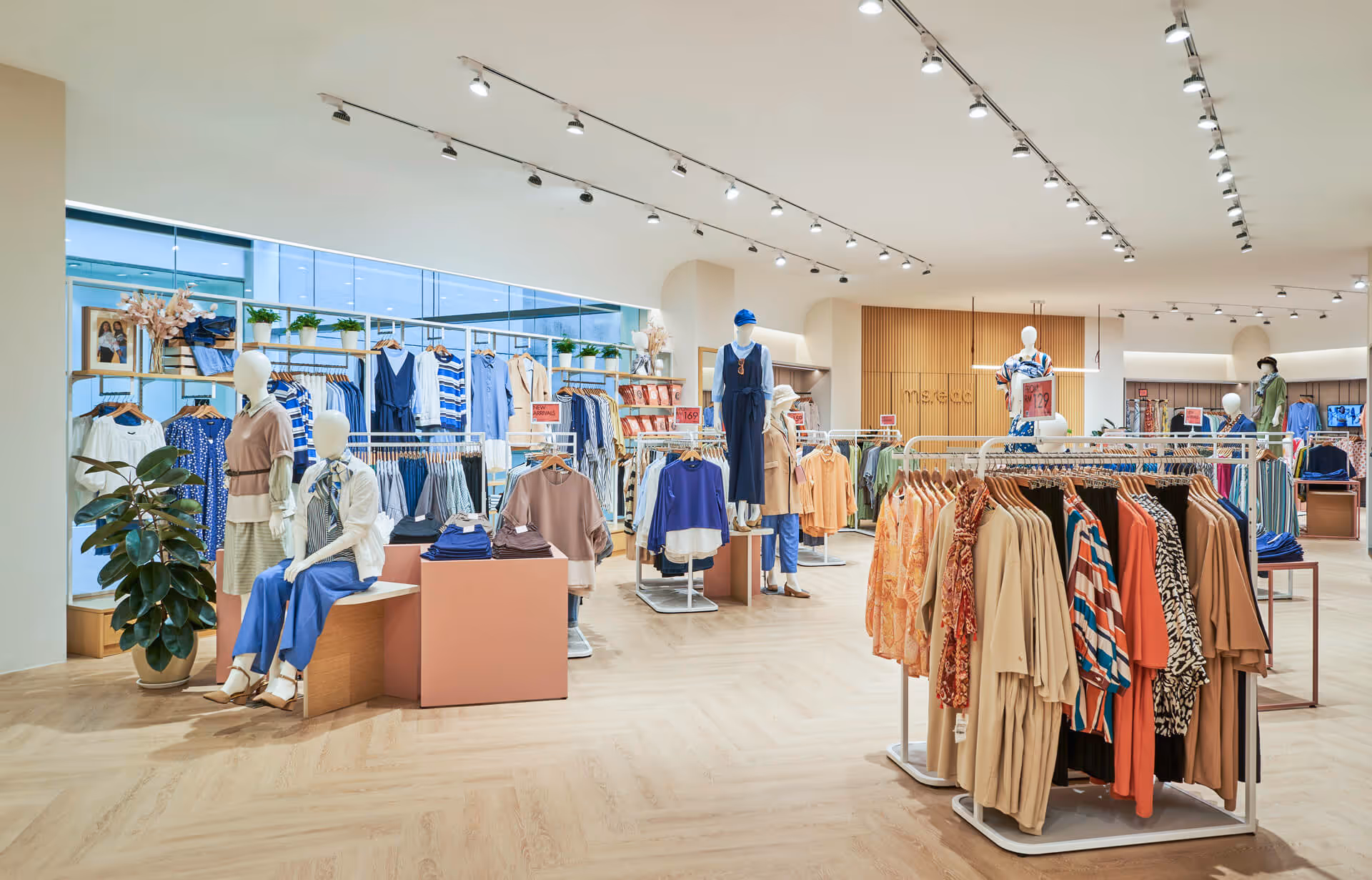 The design of the store is characterized by woody tones and warm lighting, fostering a welcoming and spacious ambiance.