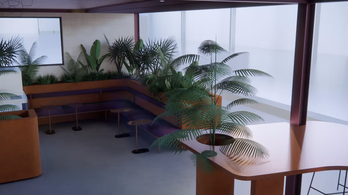 This café design blends industrial warmth with lush greenery, creating a relaxed yet energetic social hub within the pickleball centre. The space features a two-level layout with open sightlines and generous natural light. Warm tones of rust and terracotta complement exposed brick and steel framing, while vibrant plants soften the architecture, offering a refreshing biophilic touch. Custom-built counters and seating areas encourage interaction, with the upper deck providing a casual overlook of the activity below - a perfect balance between play and leisure.