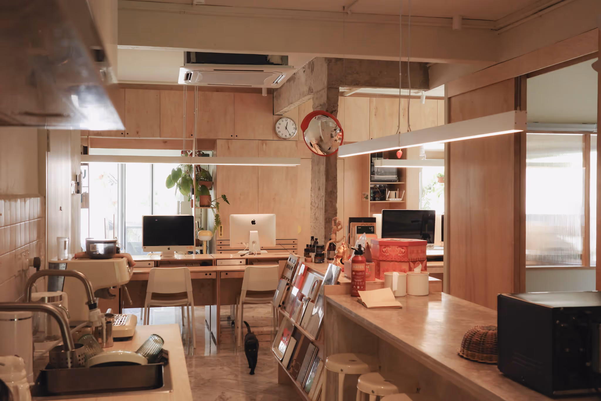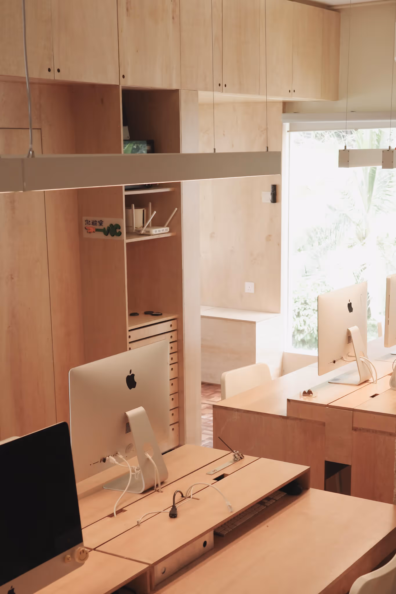 The project features custom-built carpentry, specific finishes, and functional zoning to support daily design work, collaborative discussions, private living, and moments of deep focus. Pockets of windows frame calming green views, bringing natural light and a sense of openness into the workspace. Every element was executed to embody the designer’s creative identity while delivering a practical and enduring working environment.